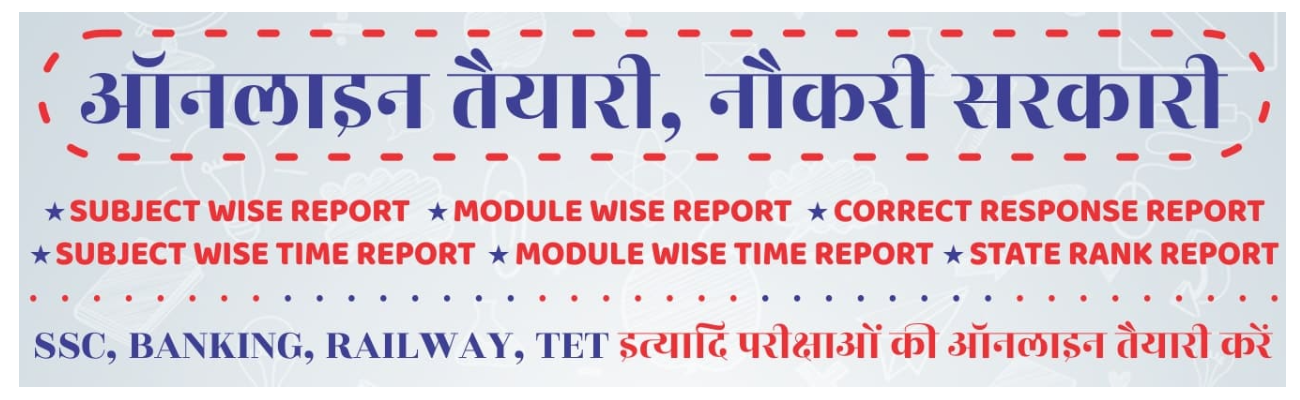 Every year, numerous government examinations are conducted for various government posts. We provide online tutorials, practice question papers, and mock tests, whose reports with detailed analysis are made available in both Hindi and English.In this way, candidates can assess their preparation through their computer and mobile phone and improve it as much as possible. Our website lists nearly 60 different types of government exams, including SSC, TET, Banking, Railways, Police, Defence, and more.Thus, candidates can evaluate their preparation and enhance it to the best extent possible through their computer and mobile phone. Our team is always ready to assist you in every possible way. Please take advantage of this opportunity.